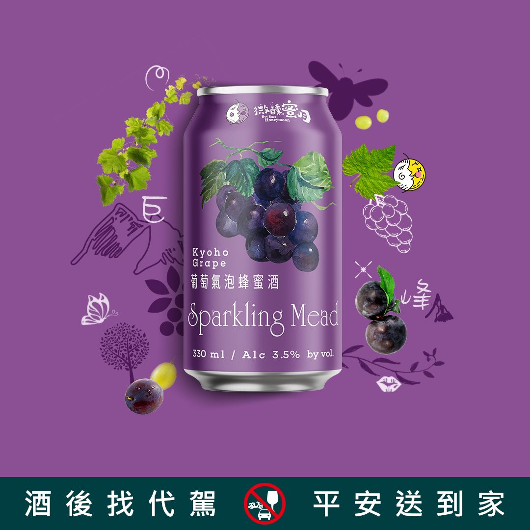 微醺蜜月與彰化縣農會聯名飲品,以微醺蜜月低溫長時發酵的蜂蜜酒為基底,加入彰化縣地區特色農作葡萄汁,釀製出香甜微酸的葡萄氣泡蜂蜜酒。開瓶時隱約飄逸的葡萄香氣,輕盈爽口的美妙滋味,伴隨著芳香紫紅葡萄汁液,襯托出蜂蜜酒甜蜜香醇尾韻,輕甜的層次優雅的質感,浪漫的微醺飲品,讓人愛不釋口!